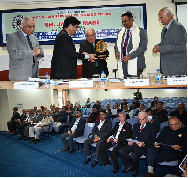 The Central Government Pensioners’ Welfare Association (CGPWA), Jammu, in collaboration with the Indian Institute of Public Administration (IIPA), Jammu & Kashmir Regional Branch, organised a Guest Lecture on “Digital Life Certificates and SBI’s Services to Senior Citizens”. The programme marked a first-of-its-kind interactive session between pensioners, senior citizens, and senior officers of the State Bank of India (SBI). The function was presided over by Shri Kuldeep Khoda, President, CGPWA, with Dr. Ashok Bhan, IPS (Retd.), Patron, IIPA J&K RB, as the Chief Guest and Shri B. R. Sharma, IAS (Retd.), Chairman, IIPA J&K RB, as the Guest of Honour. The guest lecture was delivered by Shri Jayant Mani, Deputy General Manager, SBI (Business & Development), J&K Module), who outlined various pensioner-friendly schemes and digital banking services of SBI and also highlighted SBI’s extensive national and global presence, its role in financial inclusion, and the importance of cyber awareness, particularly for senior citizens. The session included an interactive question-and-answer segment, reflecting keen interest and engagement among the participants. Addressing the gathering, the dignitaries commended SBI for its commitment to senior citizens, digital innovation, and social responsibility. The programme concluded with a formal vote of thanks by Prof. Anil Gupta, Joint Secretary, IIPA J&K RB, followed by the felicitation of the resource person. The event was attended by senior SBI officers, members of CGPWA, IIPA members, and a large number of pensioners and senior citizens.