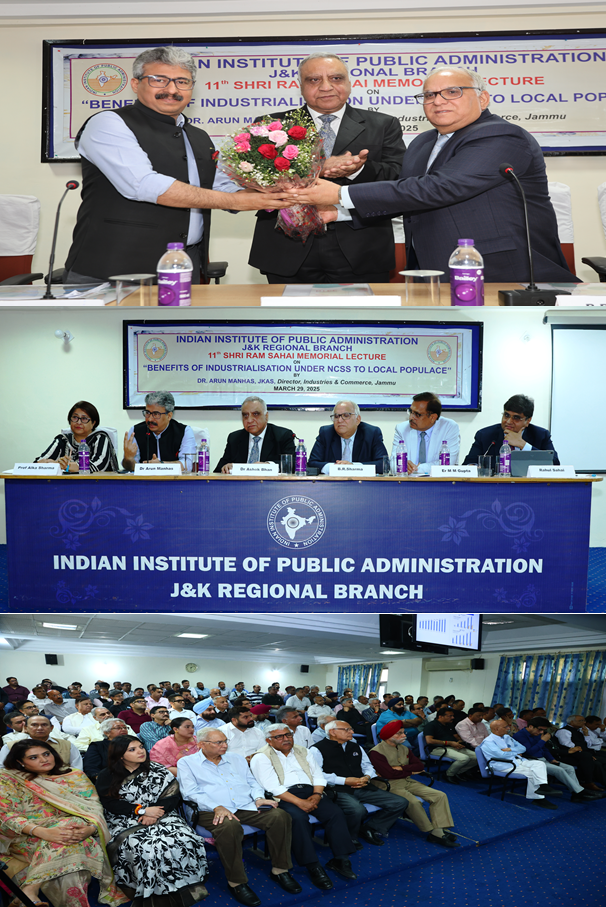 The Indian Institute of Public Administration, Jammu and Kashmir Regional Branch (IIPA J&K RB), organised the 11th Shri Ram Sahai Memorial Lecture, commemorating the contributions of Late Shri Ram Sahai.The memorial lecture was delivered by Dr. Arun Manhas, Director, Industries and Commerce, Jammu, on the theme “Benefits of Industrialisation under the New Central Sector Scheme (NCSS) to the Local Populace.” The Eminent speakers paid rich tributes to Late Shri Ram Sahai, acknowledging his enduring legacy in entrepreneurship and societal development. The lecture witnessed wide participation from industry, government officials, academia, civil society members, and the family of Late Shri Ram Sahai, reaffirming IIPA J&K RB’s commitment for creating a platform for informed dialogue on industrial and economic development in the region.