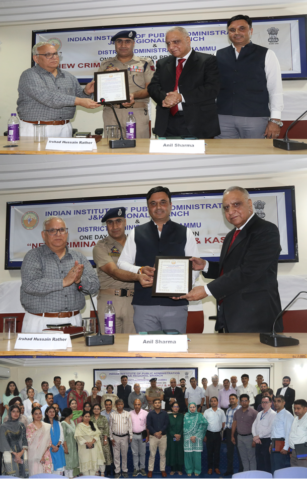 The Indian Institute of Public Administration (IIPA), J&K Regional Branch, in collaboration with the District Administration Jammu, successfully organised a One-Day Training Programme on “New Criminal Laws in Jammu & Kashmir”. The programme aimed to familiarise government officials with the newly enacted criminal laws—Bharatiya Nyaya Sanhita (BNS), Bharatiya Nagarik Suraksha Sanhita (BNSS), and Bharatiya Sakshya Adhiniyam (BSA). The technical sessions were addressed by Shri Irshad Hussain Rather, JKPS, SP Headquarters Jammu, and Shri Anil Sharma, Chief Legal Aid Defence Counsel, Jammu, who elaborated on key legal reforms, citizen-centric provisions, procedural safeguards, and the integration of technology and forensic evidence in law enforcement. Addressing the participants, Dr. Ashok Bhan, IPS (Retd.), Patron, IIPA JKRB, and Shri B. R. Sharma, IAS (Retd.), Chairman, IIPA JKRB, emphasised the need for understanding the spirit of the new laws and ensuring their effective implementation at the grassroots level. Ms. Ansuya Jamwal, JKAS, Additional Deputy Commissioner, Jammu, highlighted the District Administration’s commitment to citizen-centric governance and capacity building. The event witnessed active participation from senior district officers, civil society representatives, and members of IIPA JKRB.