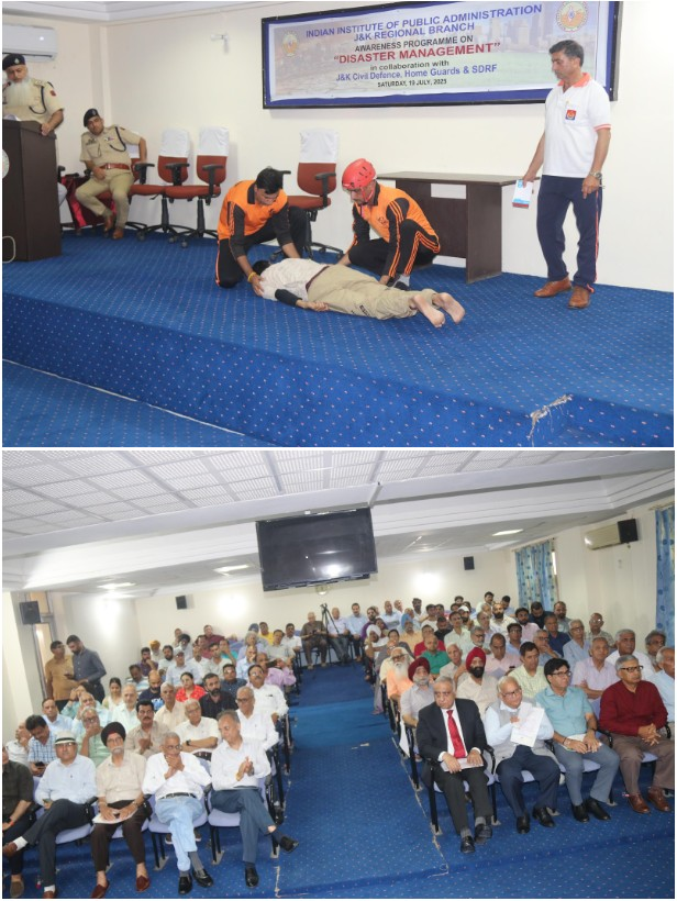 The Indian Institute of Public Administration (IIPA), Jammu & Kashmir Regional Branch, in collaboration with J&K Civil Defence, Home Guards, and SDRF, organised an Awareness Programme on “Disaster Management” on at the IIPA Complex, Jammu. The programme underscored the importance of community participation, preparedness, and integrated response mechanisms in disaster management. Shri B. R. Sharma, IAS (Retd.), Chairman, IIPA J&K RB, and Dr. Ashok Bhan, IPS (Retd.), Patron, emphasised proactive civil society engagement and coordinated institutional efforts for effective disaster mitigation and response. The programme was formally introduced by Ms. Ansuya Jamwal, JKAS, Additional Deputy Commissioner, Jammu, while Shri Imtiaz Hussain Mir, Director, Civil Defence & SDRF, highlighted the role of citizens as the first line of defence in ensuring safety and resilience. Technical sessions and live demonstrations were conducted by experts from Civil Defence and SDRF, focusing on disaster preparedness and response strategies. The event was widely participation attended by district administration officials, civil society organisations, and professional bodies.